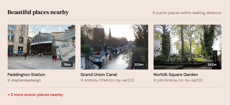Our AI, trained on 1.5 million+ human beauty ratings, finds beauty at scale: major attractions and off-the-beaten-track discoveries alike. Query by lat/lng, neighbourhood, or postcode sector.